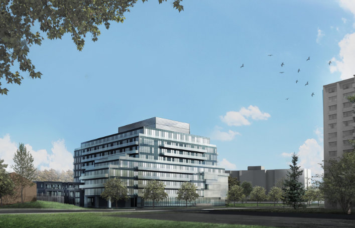 The 9-storey residential building acts as a gateway into Toronto from the west. Landscaping, trees, and benches around the site contribute to the existing park setting, providing leisure spaces for residents and community members. A playground and off-leash dog park also enhances the greenspace and public realm at the corner of Bloor and Markland.