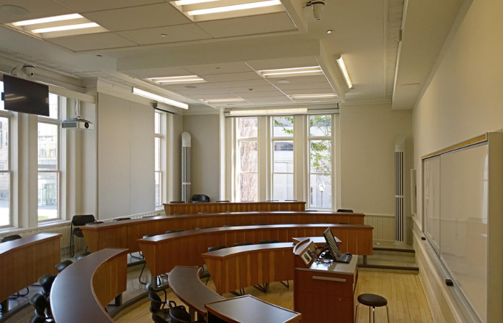 This project involves renovation of four sixty seat classrooms and upgrades to the audio visual systems, acoustic environment and finishes for each classroom. The scope of services required coordination with Queen’s audio visual consultant and included the architectural, mechanical and electrical infrastructure for the new equipment. Since Goodes Hall is listed on the City of Kingston Heritage register, care was taken in retaining part of the existing tin ceiling perimeter surrounding the new drop ceiling as a link to the building’s historic past. Similarly, new finishes to the seating and desk areas were carefully chosen to be compatible with the existing finishes. The design also included reconfiguration of the main lectern and lighting controls.